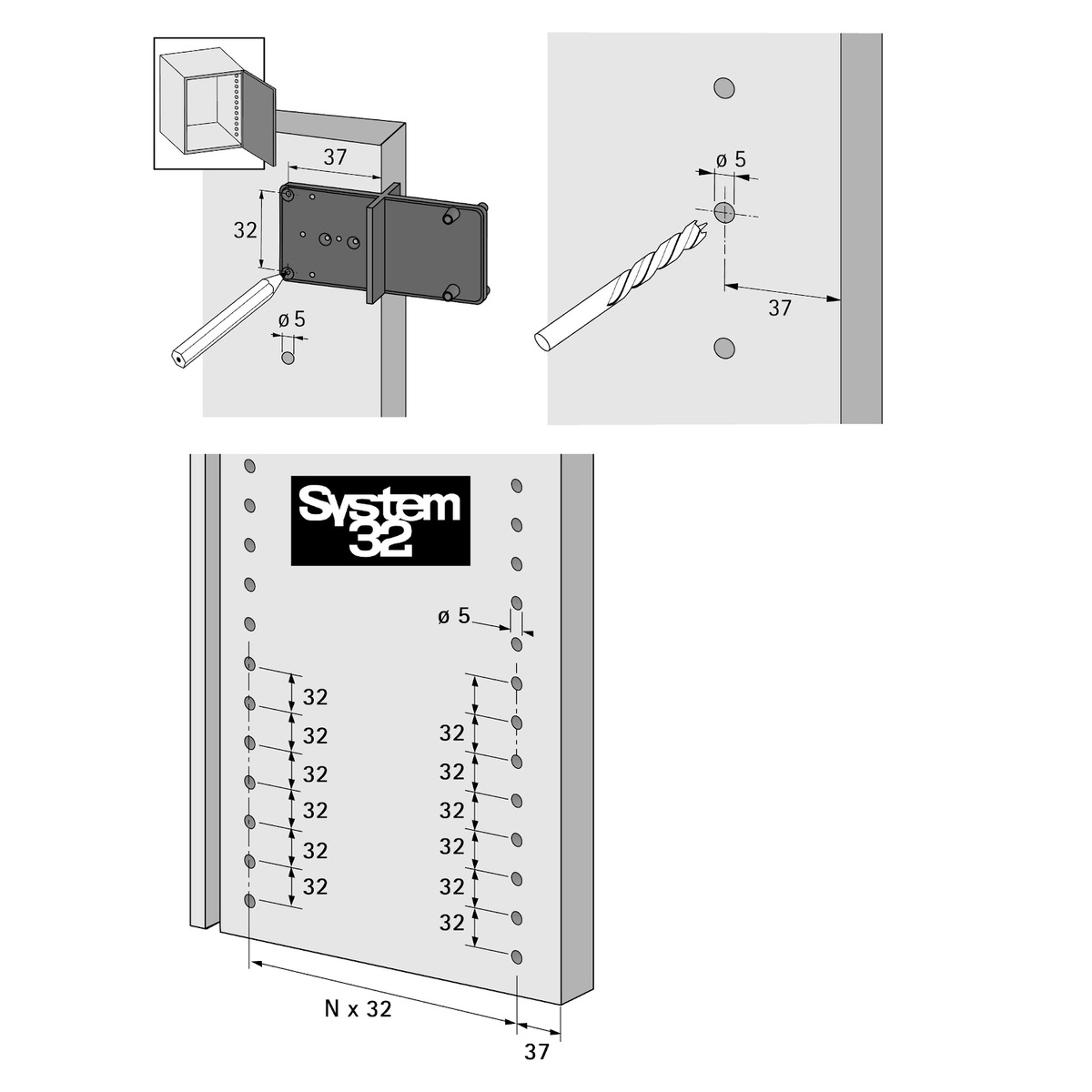 - Сверление отверстий по Системе 32, например, для монтажных планок, дюбелей, полкодержателей