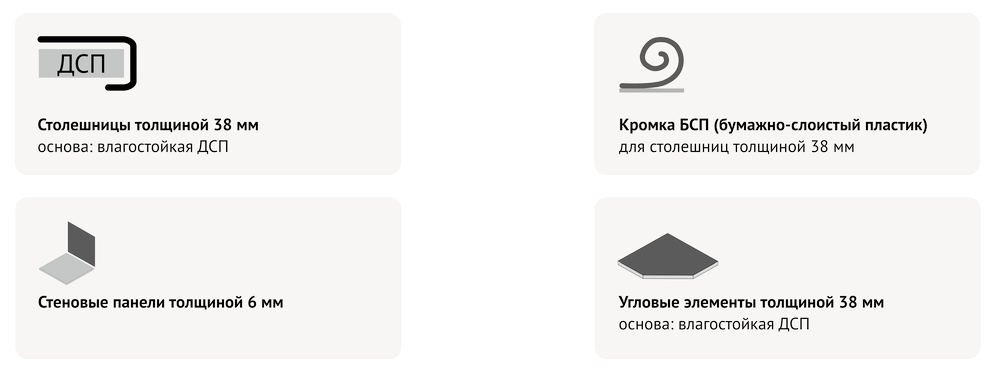 Характеристики | Столешница | Угловой элемент | Стеновая панель (кухонный фартук) | Плинтус Rehau | Кромка | |||