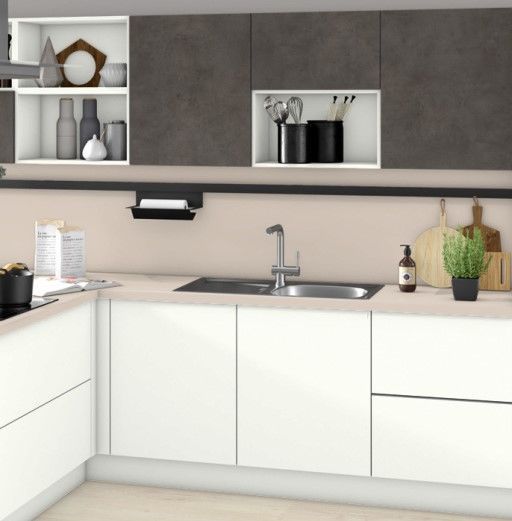 Кашемир это слегка розоватый оттенок серого, который комбинируется с красноватыми древесными декорами. Возможны также комбинации с однотонными декорами других серых оттенков или с декором Белый. Структура S2 Натуральный камень дополняет однотонный декор эффектом шершавой поверхности.