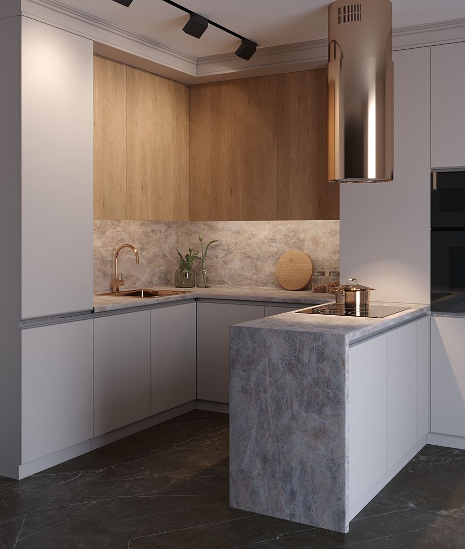 Складчатая структура камня со светлыми дымчатыми прожилками объединяет в себе серые и песочные оттенки. Достойное украшение любой кухни.