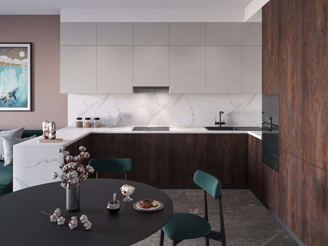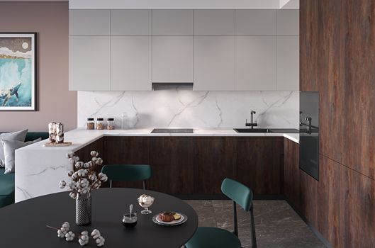 Ольхон - крупнейший шаманский остров озера Байкал, заповедник удивительных ландшафтов и величественных пейзажей. Зимой озеро замерзает и покрывается потрясающе эффектным прозрачным льдом с сетью трещин разного размера. Холодный светлый мрамор с слегка розоватым оттенком, с крупными серо-бежевыми прожилками. Благодаря своей лаконичности наполнит кухню свежим дыханием.