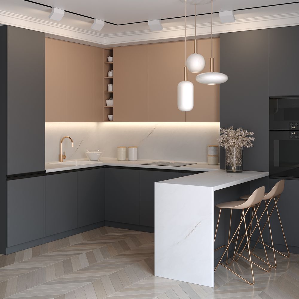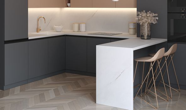 Его универсальность позволяет находить великолепные сочетания как с темными, так и со светлыми оттенками в интерьере.. Спокойный характер декора и его лаконичность наполнят вашу кухню свежим дыханием.