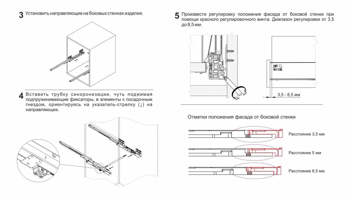 Система СТАРТ PUSH обеспечивает полное выдвижение после нажатия на фасад. Направляющие системы оснащены зубчато-реечным механизмом синхронизации, обеспечивающим равномерный ход и исключающим перекосы при движении.