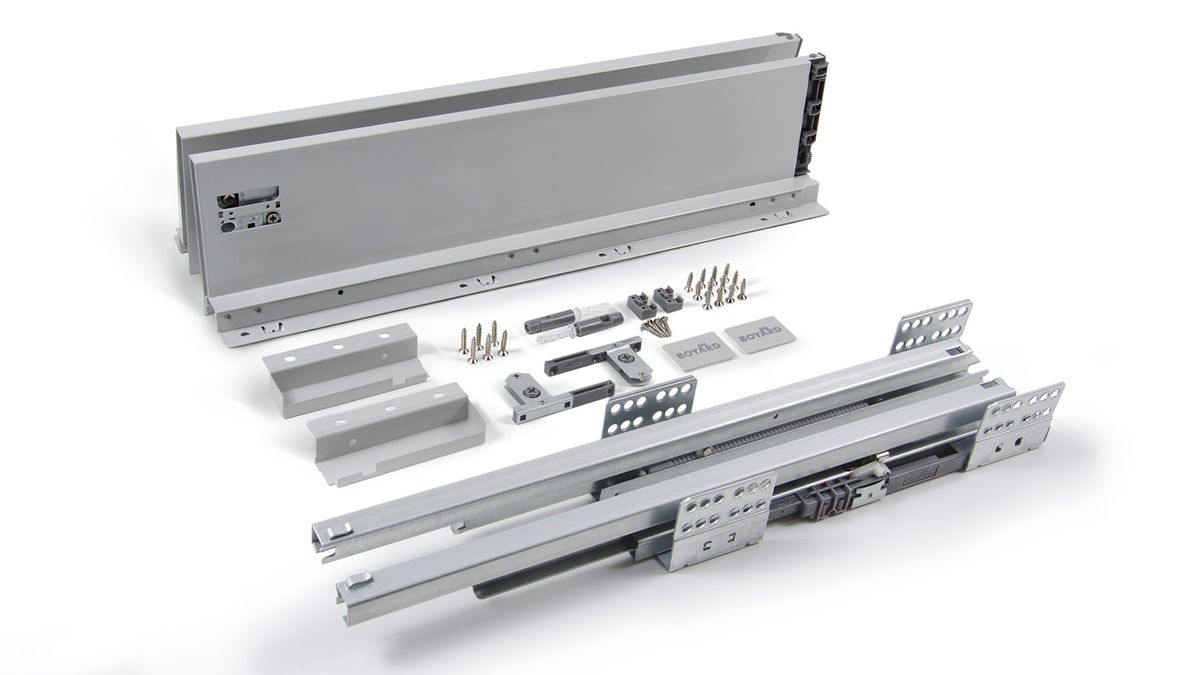 СТАРТ PUSH SB29 — комплект систем выдвижения для сборки выдвижного мебельного ящика с прямыми боковинами средней высоты с открытием от нажатия для мебели без ручек.
