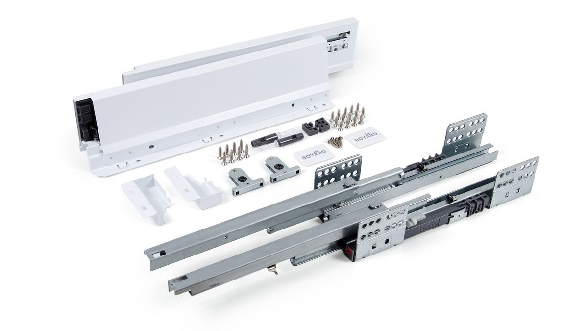 Комплект SB09 включает в себя: направляющие (левая и правая), детали для установки трубки синхронизации с крепежом, держатели задней стенки, традиционные боковые стенки, фиксаторы фасада, заглушки, крепёж.