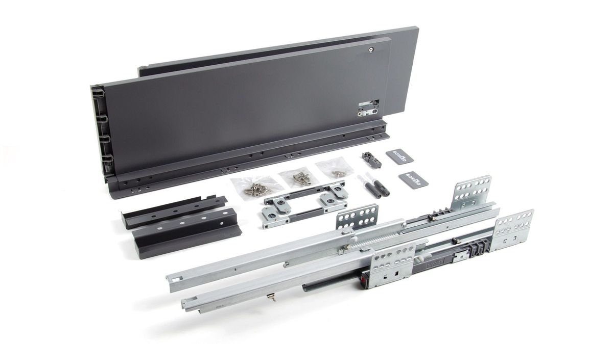 СТАРТ PUSH SB30 — комплект систем выдвижения для сборки высокого выдвижного мебельного ящика с прямыми боковинами с открытием от нажатия для мебели без ручек.