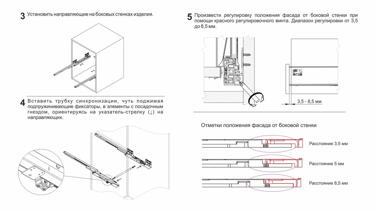 Конструкция СТАРТ PUSH SB29 имеет регулировочный красный винт — он позволяет выровнять фасады по глубине и компенсировать погрешности производства и монтажа. Специальные риски на направляющей помогут выставить одинаковое положение регулировки на обеих направляющих (левой и правой).