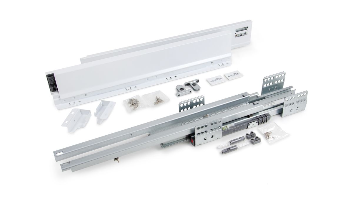 СТАРТ PUSH SB09 — комплект систем выдвижения для сборки выдвижного мебельного ящика с традиционными боковинами стандартной высоты с открытием от нажатия для мебели без ручек.