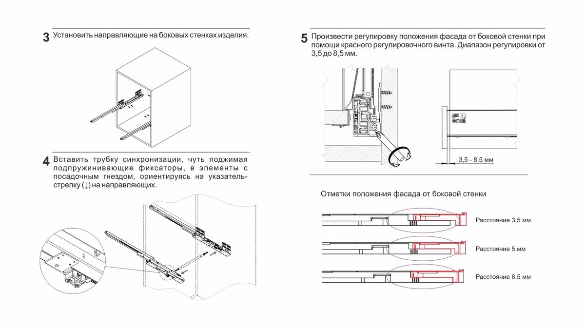 Конструкция СТАРТ PUSH SB09 имеет регулировочный красный винт — он позволяет выровнять фасады по глубине и компенсировать погрешности производства и монтажа. Специальные риски на направляющей помогут выставить одинаковое положение регулировки на обеих направляющих (левой и правой).