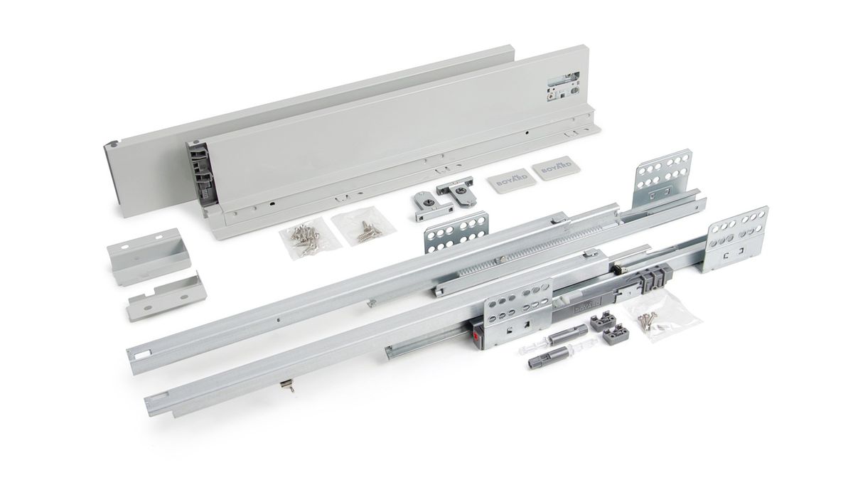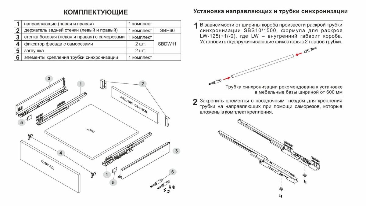 Комплект SB28 включает в себя: направляющие (левая и правая), детали для установки трубки синхронизации с крепежом, держатели задней стенки, традиционные боковые стенки, фиксаторы фасада, заглушки, крепёж.