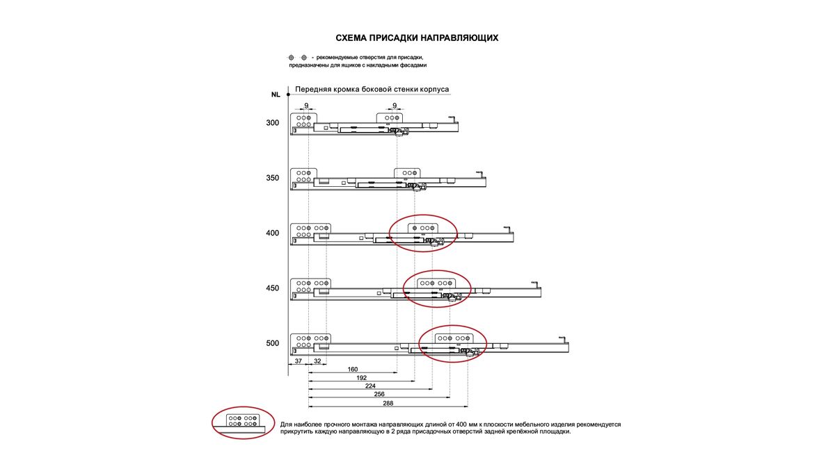 Для наиболее прочного монтажа направляющих длиной от 400 мм к плоскости мебельного изделия рекомендуется прикрутить каждую направляющую в 2 ряда присадочных отверстий задней крепёжной площадки.