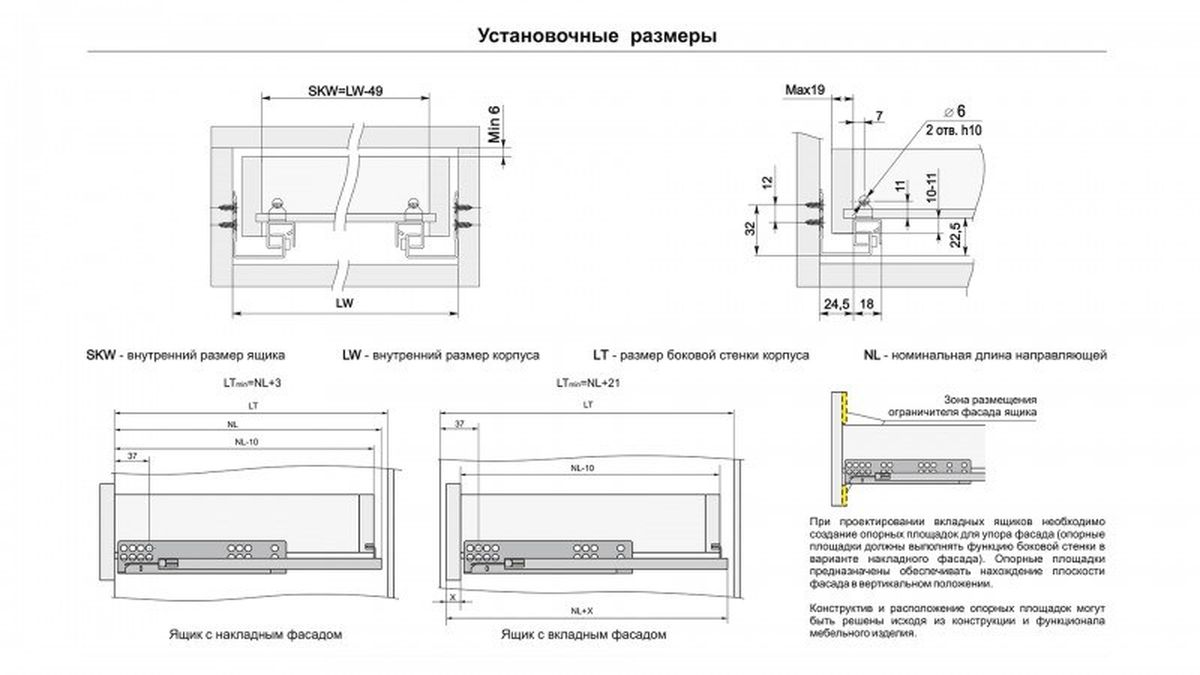 Следуя инструкции по установке направляющих, при создании внутренних ящиков или ящиков с вкладными фасадами не забудьте предусмотреть специальный ограничитель или упор, чтобы фасады всех ящиков выровнялись относительно боковых стенок корпуса и встали в одну линию.