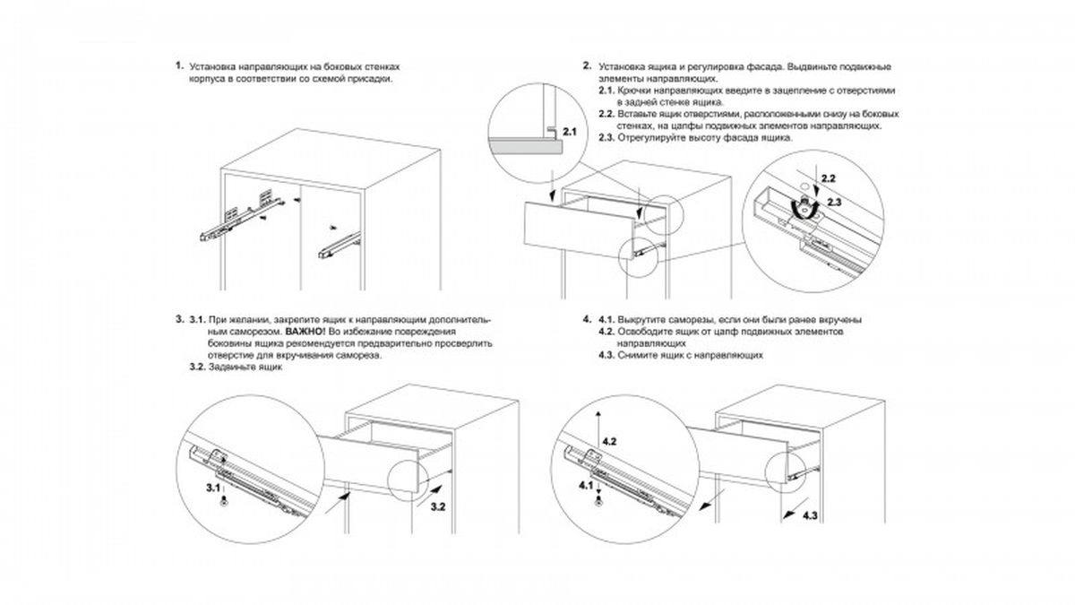 Для наиболее прочного монтажа направляющих длиной от 400 мм к плоскости мебельного изделия рекомендуется прикрутить каждую направляющую в 2 ряда присадочных отверстий задней крепёжной площадки.