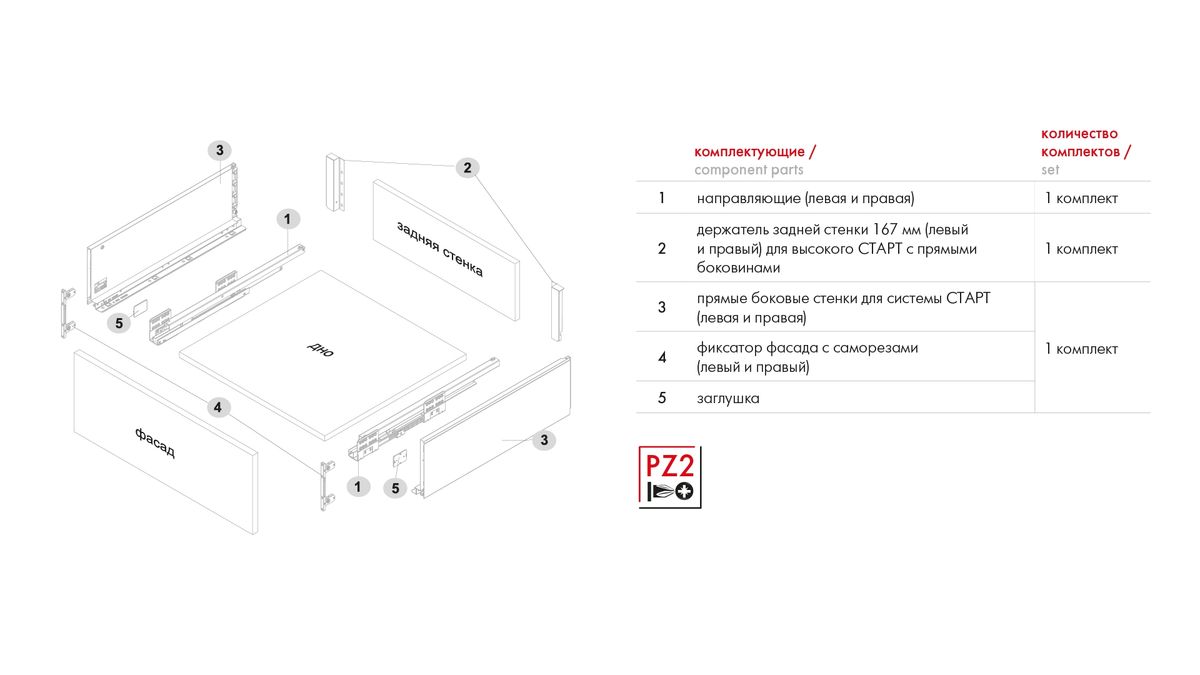 СТАРТ SB20 – комплект систем выдвижения для сборки высокого выдвижного мебельного ящика с прямыми боковинами высотой 167 мм для минимальной высоты проёма 198 мм. Комплект включает в себя направляющие, прямые боковины, держатели фасада и задней стенки, заглушки с логотипом BOYARD и необходимый крепёж.