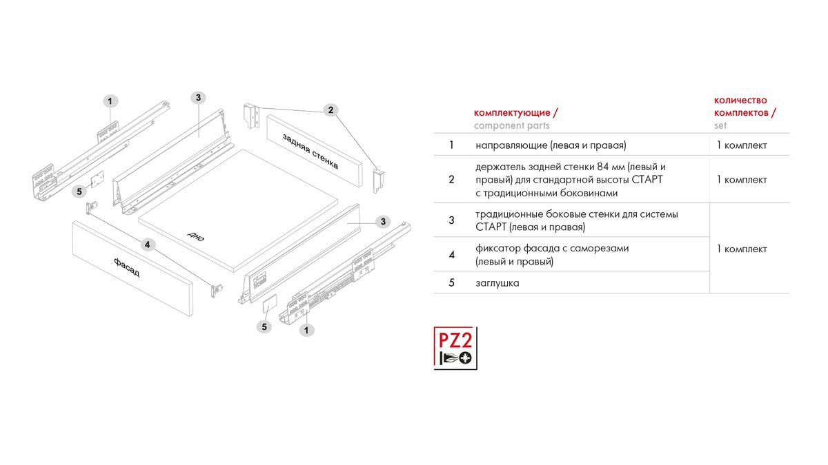 СТАРТ SB08 – комплект систем выдвижения для сборки выдвижного мебельного ящика с традиционными боковинами стандартной высоты. Комплект включает в себя: направляющие, традиционные боковины, держатели фасада и задней стенки, заглушки с логотипом BOYARD и необходимый крепёж.