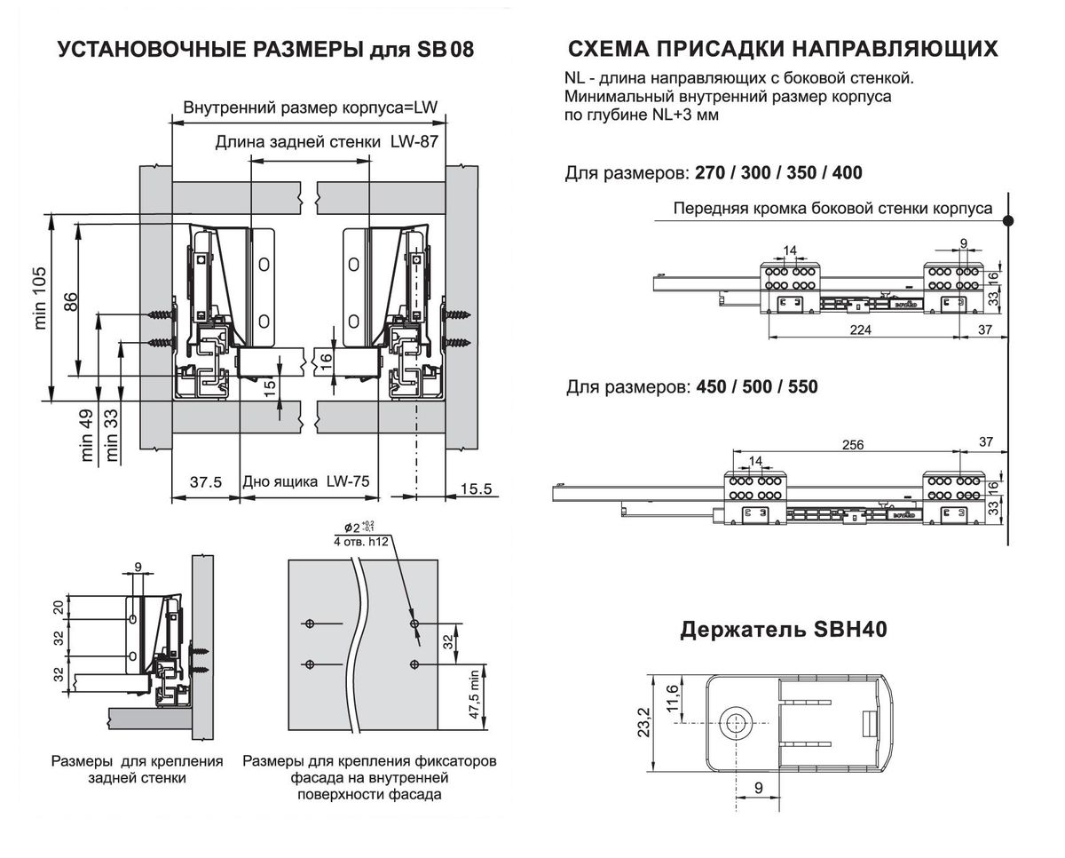 Направляющие оснащены зубчато-реечным механизмом синхронизации, который исключает перекосы при использовании и обеспечивает равномерный ход. DB8181 имеют европейские стандарты присадки кратные 32 мм. Сами отверстия для крепления направляющих имеют диаметр 6 мм, что позволяет использовать евровинт при монтаже.