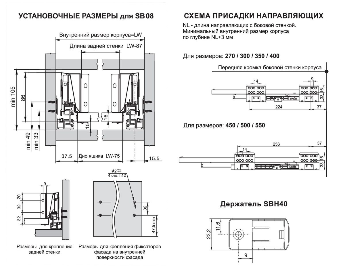 Для сборки выдвижного мебельного ящика с помощью традиционных боковин SBDW08 необходимо самостоятельно изготовить фасад, заднюю стенку и дно ящика с учетом собственных пожеланий и потребностей по ширине и высоте готового ящика.