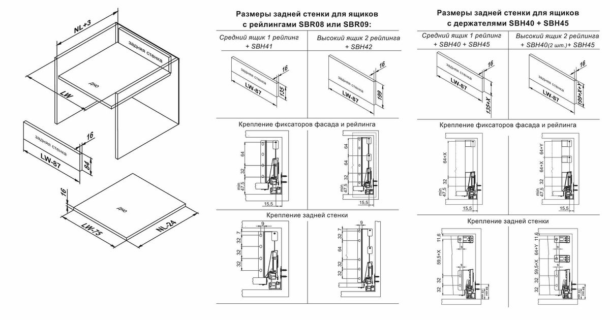 SBR08 – круглый рейлинг, предназначенный для формирования выдвижных мебельных ящиков разной высоты. Применяется с держателями рейлинга SBH40 и держателями задней стенки SBH45 для формирования выдвижного мебельного ящика любой высоты, а также с держателями задней стенки SBH41 и SBH42 для формирования средних и высоких выдвижных ящиков.