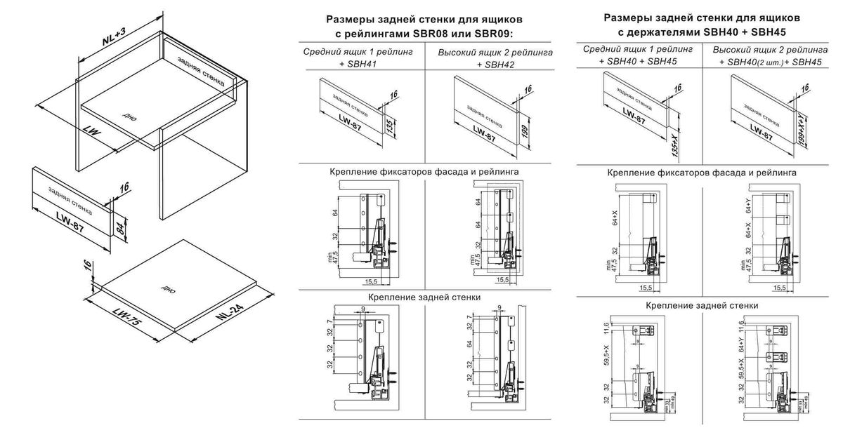 SBR08 – круглый рейлинг, предназначенный для формирования выдвижных мебельных ящиков разной высоты. Применяется с держателями рейлинга SBH40 и держателями задней стенки SBH45 для формирования выдвижного мебельного ящика любой высоты, а также с держателями задней стенки SBH41 и SBH42 для формирования средних и высоких выдвижных ящиков.
