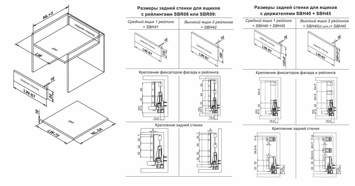 SBR09 – прямоугольный рейлинг, предназначенный для формирования выдвижных мебельных ящиков. Применяется с держателями рейлинга SBH40 и держателями задней стенки SBH61, SBH62, SBH63 (в зависимости от выбранной высоты боковин) для формирования выдвижного мебельного ящика любой желаемой высоты с прямыми боковинами в графитовом цвете.