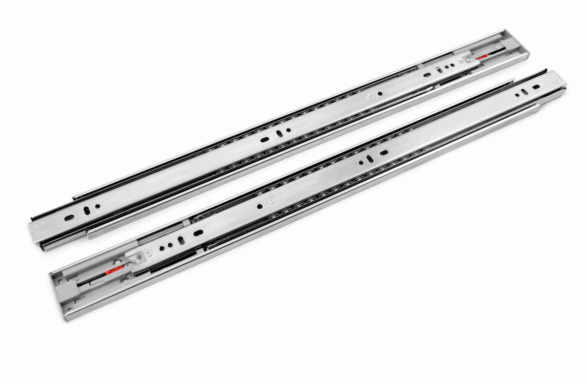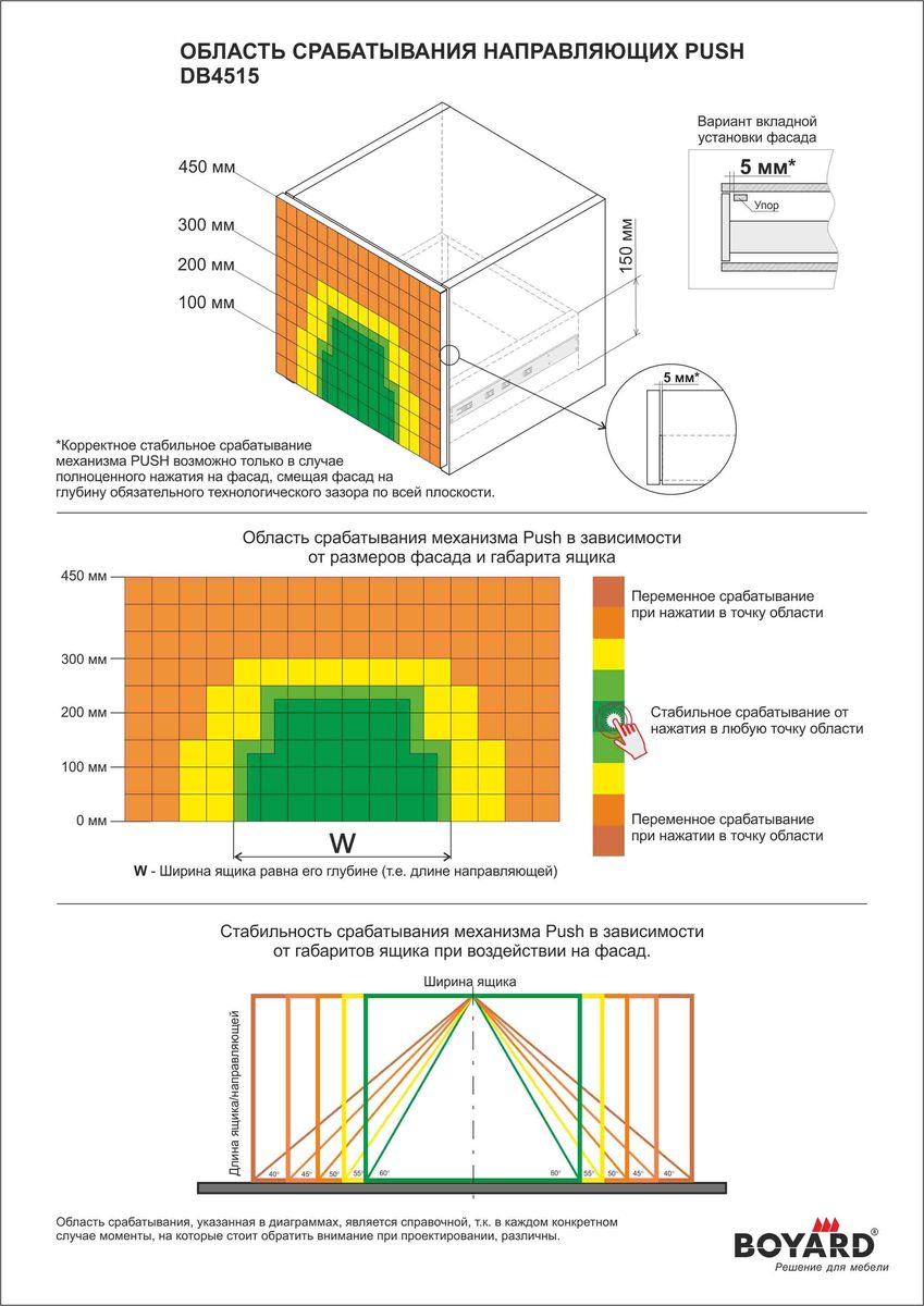 Ключевая особенность направляющих – инновационный механизм толкателя: при случайном открытии ящика без нажатия подвижная часть направляющей соскакивает с механизма и свободно выдвигается. Для установки ящика в исходное положение без повреждений достаточно задвинуть его обратно.