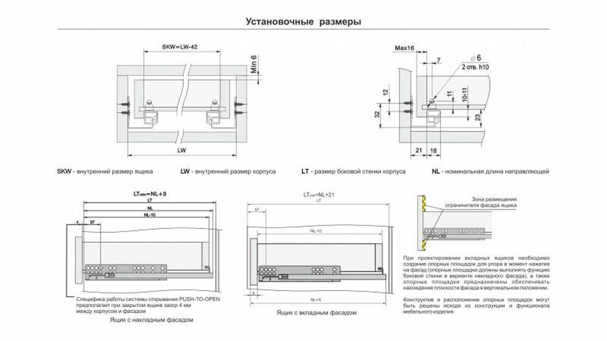 Следуя инструкции по установке направляющих, при создании внутренних ящиков или ящиков с вкладными фасадами не забудьте предусмотреть специальный ограничитель или упор, чтобы фасады всех ящиков выровнялись относительно боковых стенок корпуса и встали в одну линию.