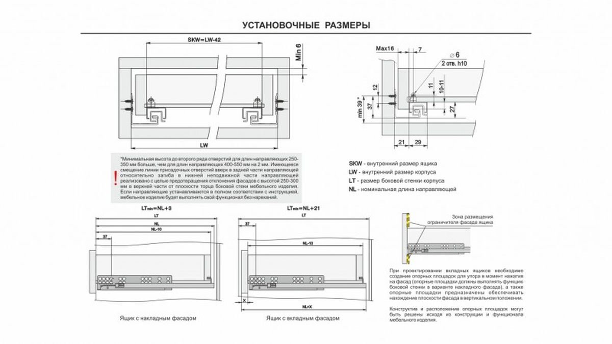 Разница в монтаже коротких и больших длин заключается в значении min отступа от дна мебельного корпуса до верхнего ряда присадочных отверстий направляющей. У неглубоких моделей, до 350 мм включительно, это значение составляет min 39 мм. Установка по схеме позволяет достичь зазора в 2 мм между мебельным корпусом и направляющей. Именно корректный монтаж, в соответствие со схемой, позволяет избежать отклонения фасада с высотой 250-300 мм в верхней части от плоскости торца боковой стенки мебельного изделия.