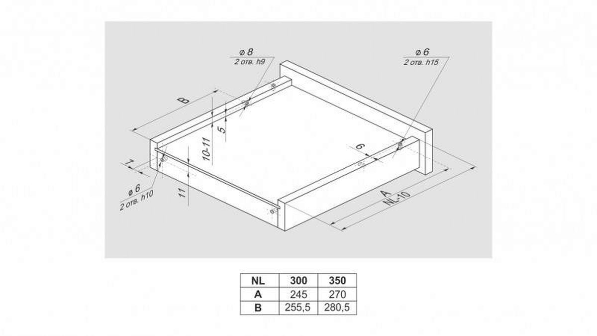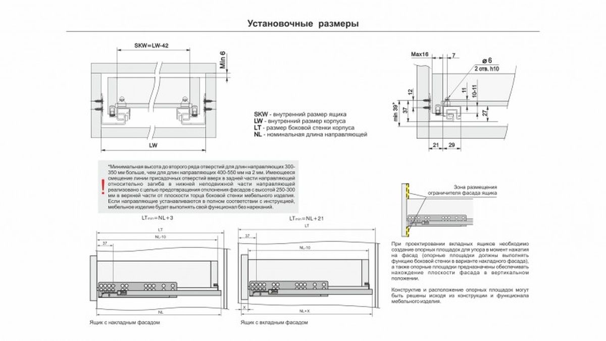 Разница в монтаже коротких и больших длин заключается в значении min отступа от дна мебельного корпуса до верхнего ряда присадочных отверстий направляющей. У неглубоких моделей, до 350 мм включительно, это значение составляет min 39 мм. Установка по схеме позволяет достичь зазора в 2 мм между мебельным корпусом и направляющей. Именно корректный монтаж, в соответствие со схемой, позволяет избежать отклонения фасада с высотой 250-300 мм в верхней части от плоскости торца боковой стенки мебельного изделия.