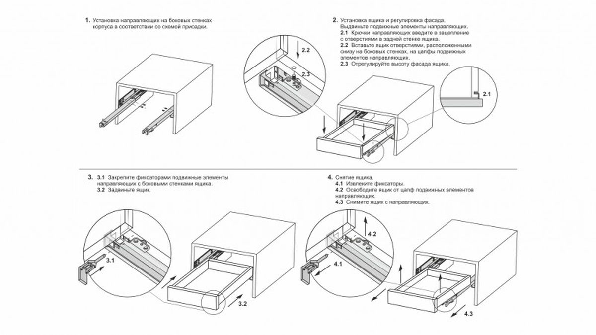 Следуя инструкции по установке направляющих, при создании внутренних ящиков или ящиков с вкладными фасадами не забудьте предусмотреть специальный ограничитель или упор, чтобы фасады всех ящиков выровнялись относительно боковых стенок корпуса и встали в одну линию.