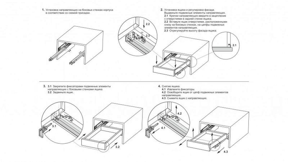 Следуя инструкции по установке направляющих, при создании внутренних ящиков или ящиков с вкладными фасадами не забудьте предусмотреть специальный ограничитель или упор, чтобы фасады всех ящиков выровнялись относительно боковых стенок корпуса и встали в одну линию.