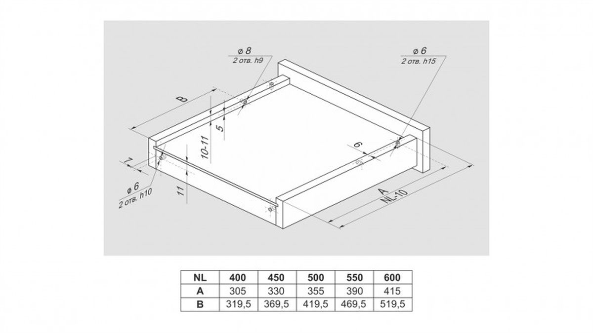Разница в монтаже коротких и больших длин заключается в значении min отступа от дна мебельного корпуса до верхнего ряда присадочных отверстий направляющей. У неглубоких моделей, до 350 мм включительно, это значение составляет min 39 мм. Установка по схеме позволяет достичь зазора в 2 мм между мебельным корпусом и направляющей. Именно корректный монтаж, в соответствие со схемой, позволяет избежать отклонения фасада с высотой 250-300 мм в верхней части от плоскости торца боковой стенки мебельного изделия.