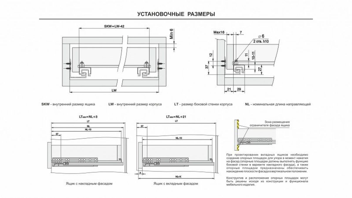 Разница в монтаже коротких и больших длин заключается в значении min отступа от дна мебельного корпуса до верхнего ряда присадочных отверстий направляющей. У неглубоких моделей, до 350 мм включительно, это значение составляет min 39 мм. Установка по схеме позволяет достичь зазора в 2 мм между мебельным корпусом и направляющей. Именно корректный монтаж, в соответствие со схемой, позволяет избежать отклонения фасада с высотой 250-300 мм в верхней части от плоскости торца боковой стенки мебельного изделия.