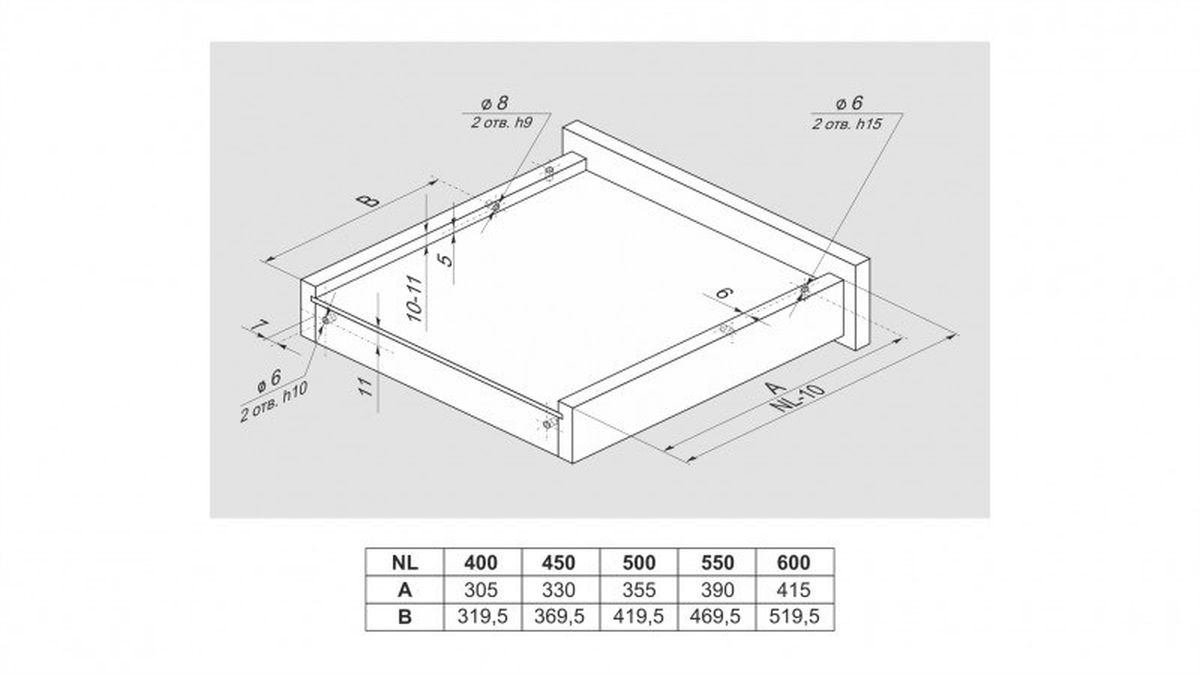 Разница в монтаже коротких и больших длин заключается в значении min отступа от дна мебельного корпуса до верхнего ряда присадочных отверстий направляющей. У неглубоких моделей, до 350 мм включительно, это значение составляет min 39 мм. Установка по схеме позволяет достичь зазора в 2 мм между мебельным корпусом и направляющей. Именно корректный монтаж, в соответствие со схемой, позволяет избежать отклонения фасада с высотой 250-300 мм в верхней части от плоскости торца боковой стенки мебельного изделия.