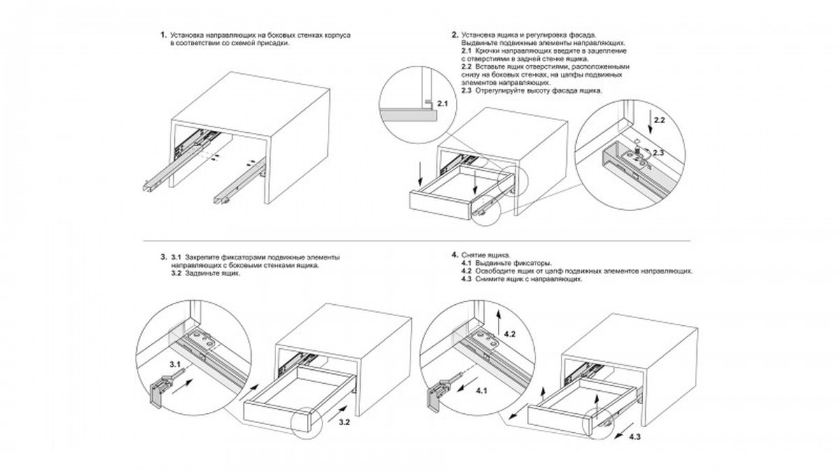 Следуя инструкции по установке направляющих, при создании внутренних ящиков или ящиков с вкладными фасадами не забудьте предусмотреть специальный ограничитель или упор, чтобы фасады всех ящиков выровнялись относительно боковых стенок корпуса и встали в одну линию.