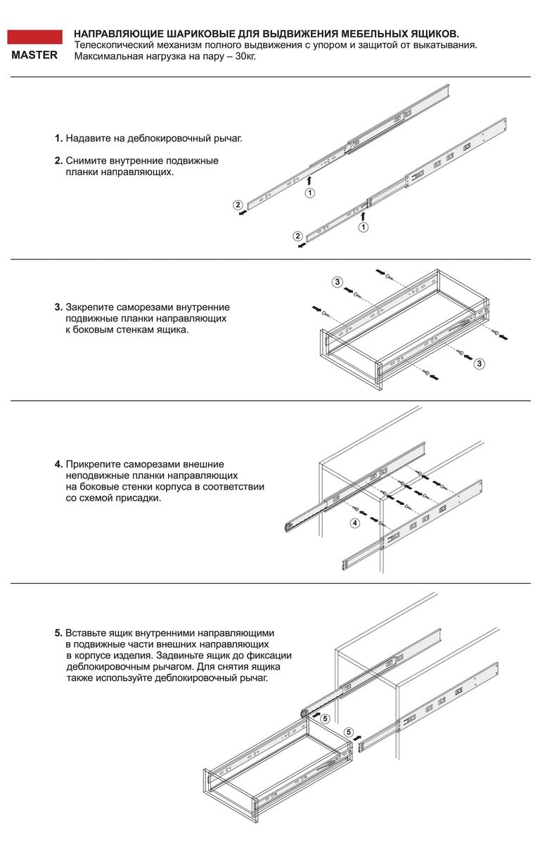 Master DB4504 – 172 полного выдвижения без амортизации, выполненные по европейскому стандарту. Это надежный партнер мебельщика в производстве добротной мебели сегмента «средний» и «средний+». Master DB4504 обладает современными характеристиками и обеспечивает стабильную работу ящиков и плавный, равномерный ход, сравнимый по комфорту с движением современных систем выдвижения. Модель надежна и долговечна – она обладает оптимальной грузоподъемностью до 30 кг (зависит от монтажной длины) и гарантирует бесперебойную работу направляющей на протяжении более 50 000 циклов открывания/закрывания.