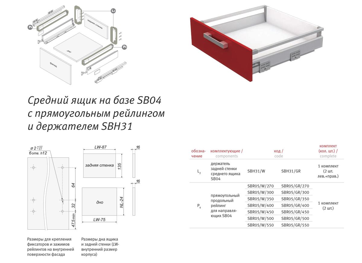 SBH31 – держатель задней стенки выдвижного ящика средней высоты под минимально необходимый проем 160 мм, сформированного на базе направляющих B-box. Держатель SBH31 предназначен для надежной фиксации задней стенки с металлическими боковинами B-box и установки круглого или прямоугольного рейлинга. Материал – прочная и долговечная сталь с порошковым покрытием. Держатель задней стенки SBH31 представлен в двух актуальных цветах: белый и серый. В комплекте есть левый и правый держатель.
