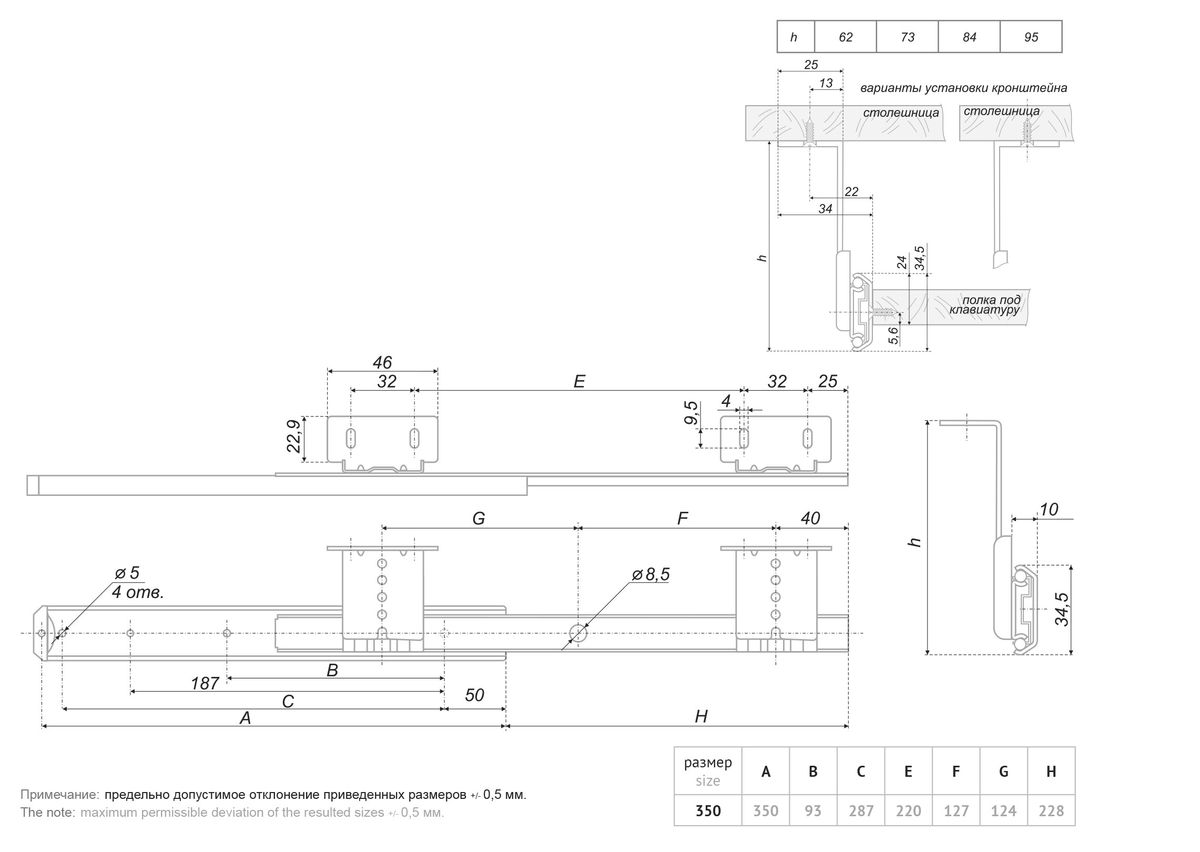 Направляющие шариковые для полок под клавиатуру. Телескопический механизм неполного выдвижения (3/4 длины), двухсекционный, неразборный, верхнее крепление (к столешнице). Фиксированные высоты установки от 62 мм до 95 мм.