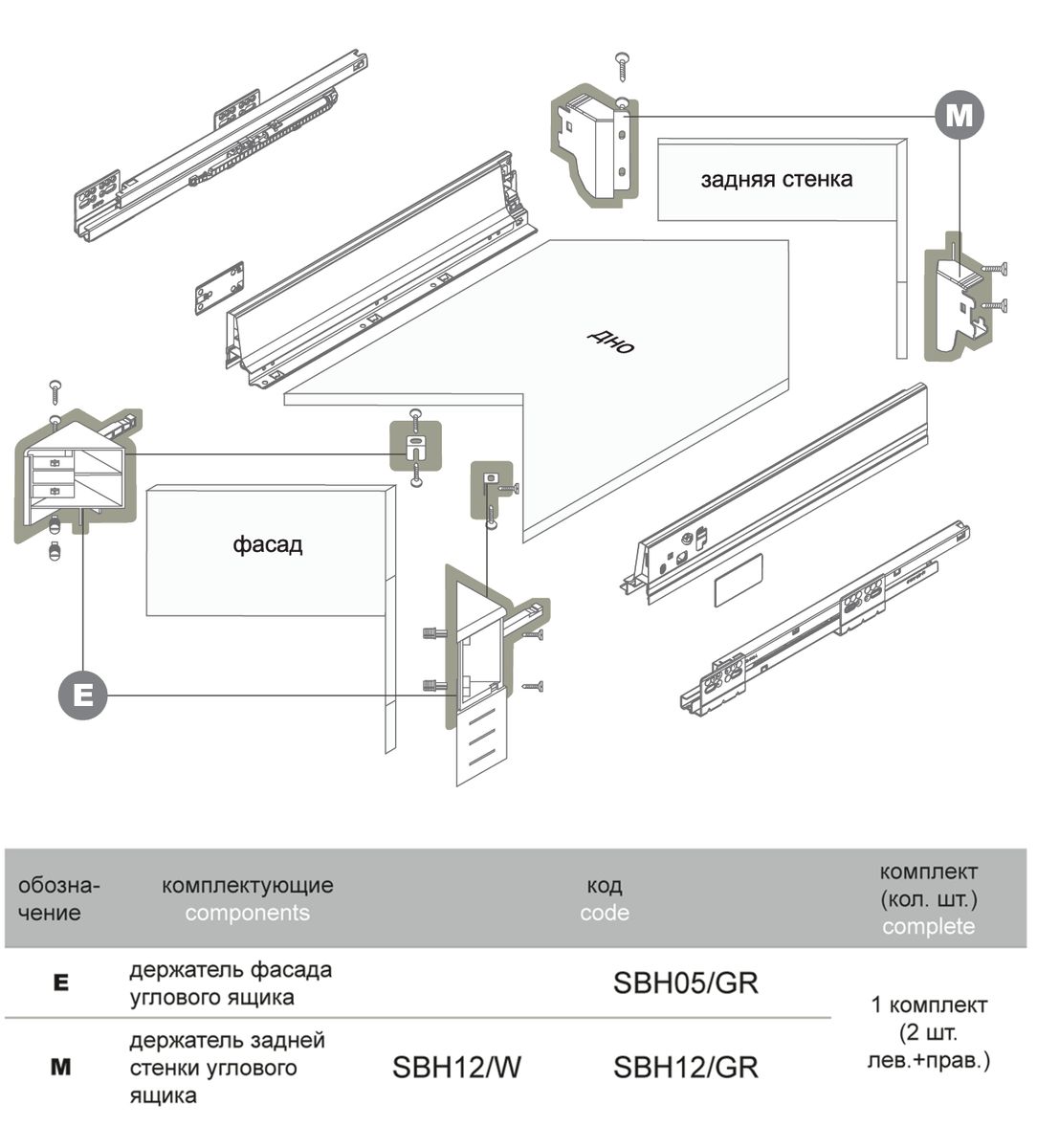 Держатель фасада углового ящика предназначен для надежной фиксации фасада углового ящика. Необычная форма фасада и острый угол, под которым фасад соединяется с боковой стенкой, требуют выверенного крепежного решения. Поэтому для возможности формирования эргономичного углового ящика BOYARD предлагает специальный держатель фасада, отвечающий всем требованиям угловой формы.