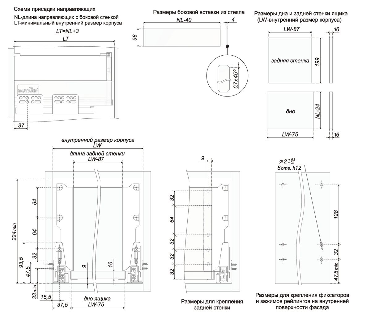 Держатель боковой вставки из стекла передний предназначен для крепления боковой стеклянной вставки выдвижного ящика около фасада – между металлической боковиной и продольным рейлингом.