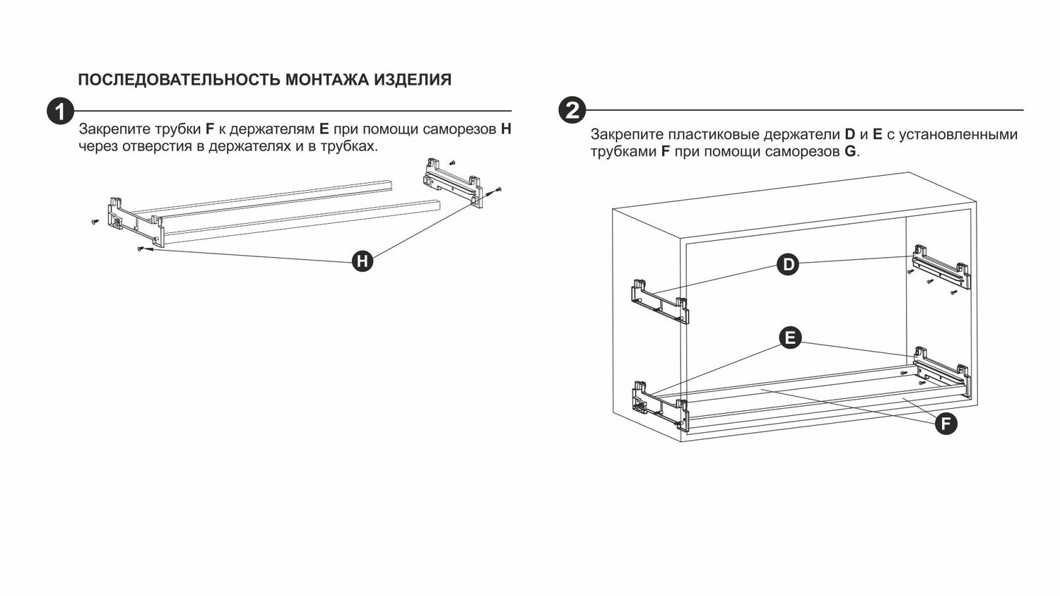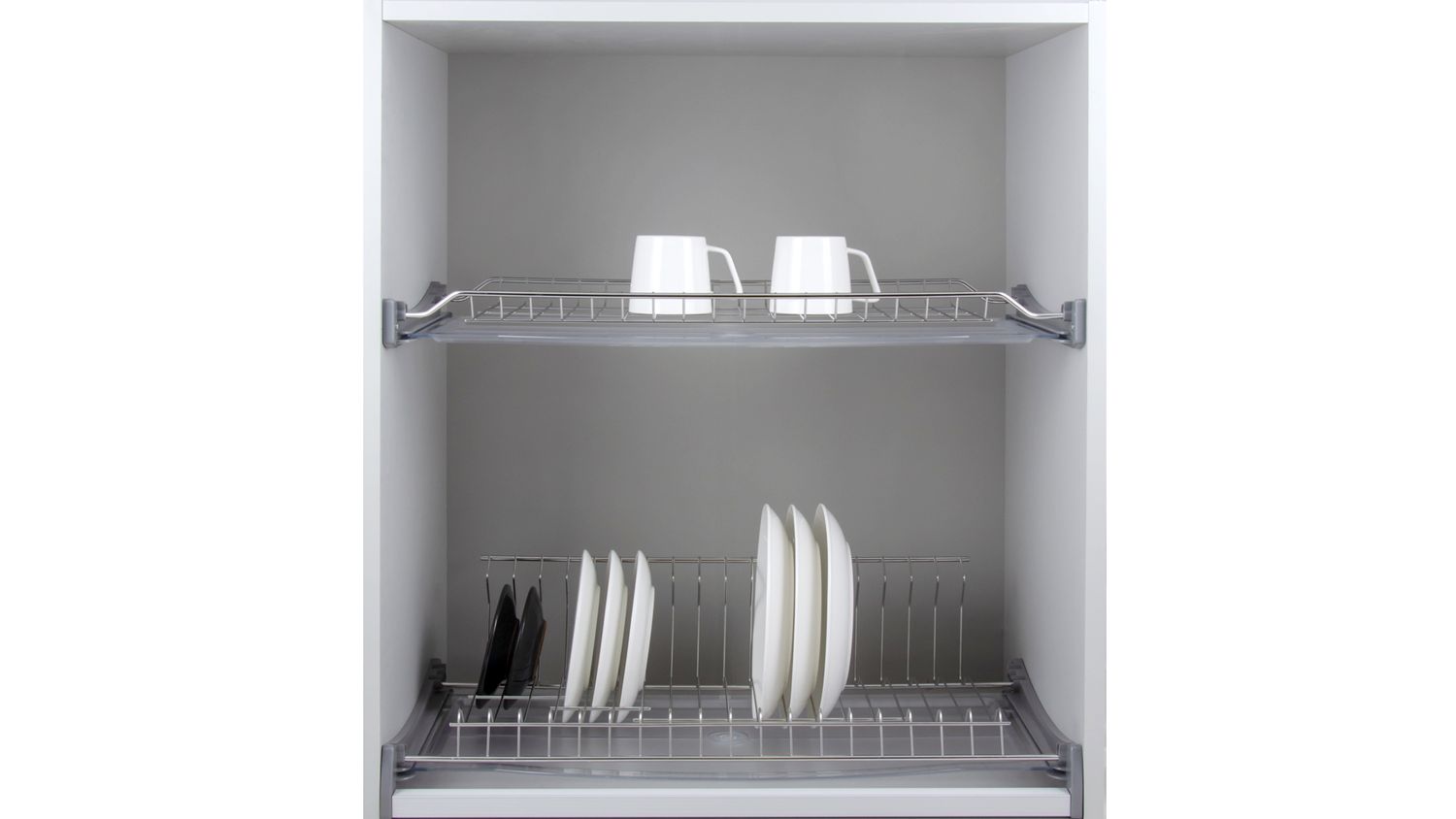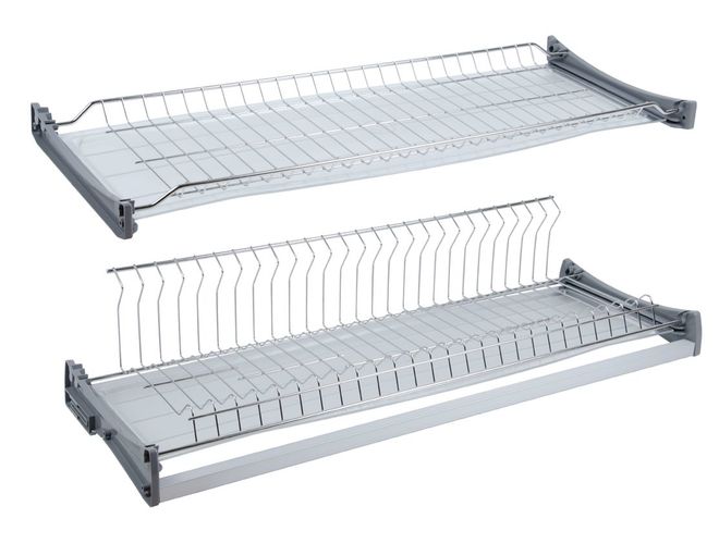 В комплект входит: 2 уровня сушки (решётка для кружек и L-образная решётка для тарелок), 2 пластиковых поддона, 2 комплекта пластиковых держателей нижнего и верхнего уровня, 2 соединительных трубки, саморезы M4x20 – 10 штук, 3,5х8 – 4 штуки.
