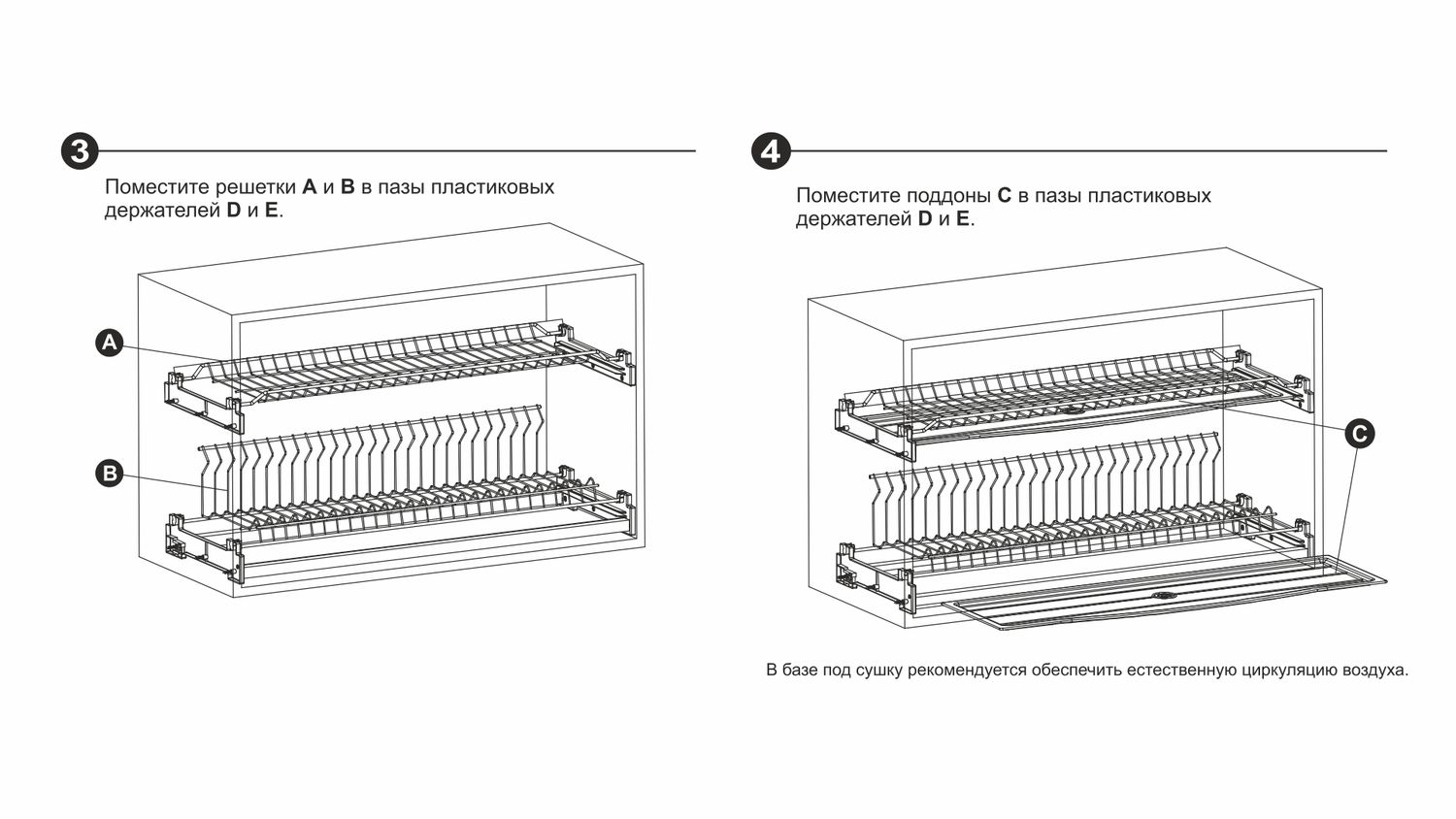 В комплект входит: 2 уровня сушки (решётка для кружек и L-образная решётка для тарелок), 2 пластиковых поддона, 2 комплекта пластиковых держателей нижнего и верхнего уровня, 2 соединительных трубки, саморезы M4x20 – 10 штук, 3,5х8 – 4 штуки.
