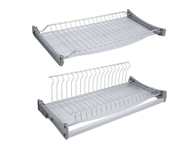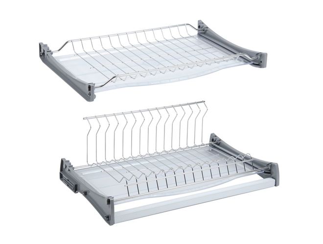 В комплект входит: 2 уровня сушки (решётка для кружек и L-образная решётка для тарелок), 2 пластиковых поддона, 2 комплекта пластиковых держателей нижнего и верхнего уровня, 2 соединительных трубки, саморезы M4x20 – 10 штук, 3,5х8 – 4 штуки.