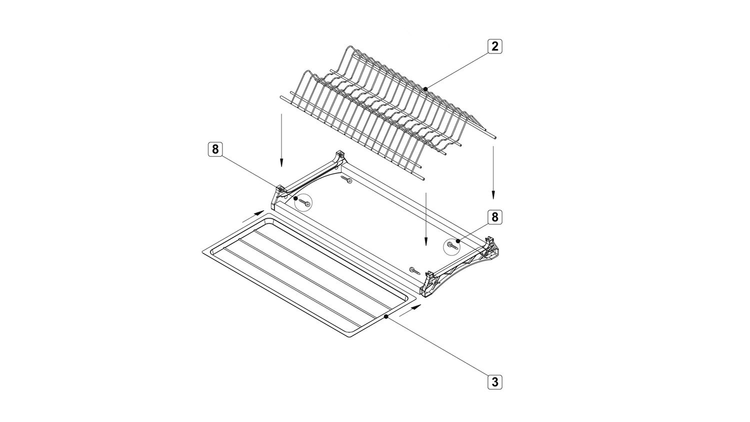 Комплект сушки включает 2 яруса для хранения посуды с надёжным гальваническим покрытием с эффектом хромирования, 2 съёмных поддона из качественного бесцветного пластика, 4 пластиковых серых держателя нижнего и верхнего уровней, переднюю и заднюю алюминиевые трубки, саморезы для монтажа сушки и крепления трубки.