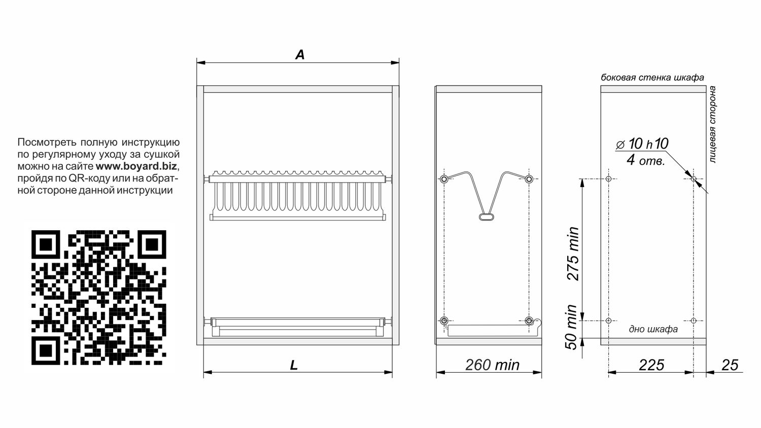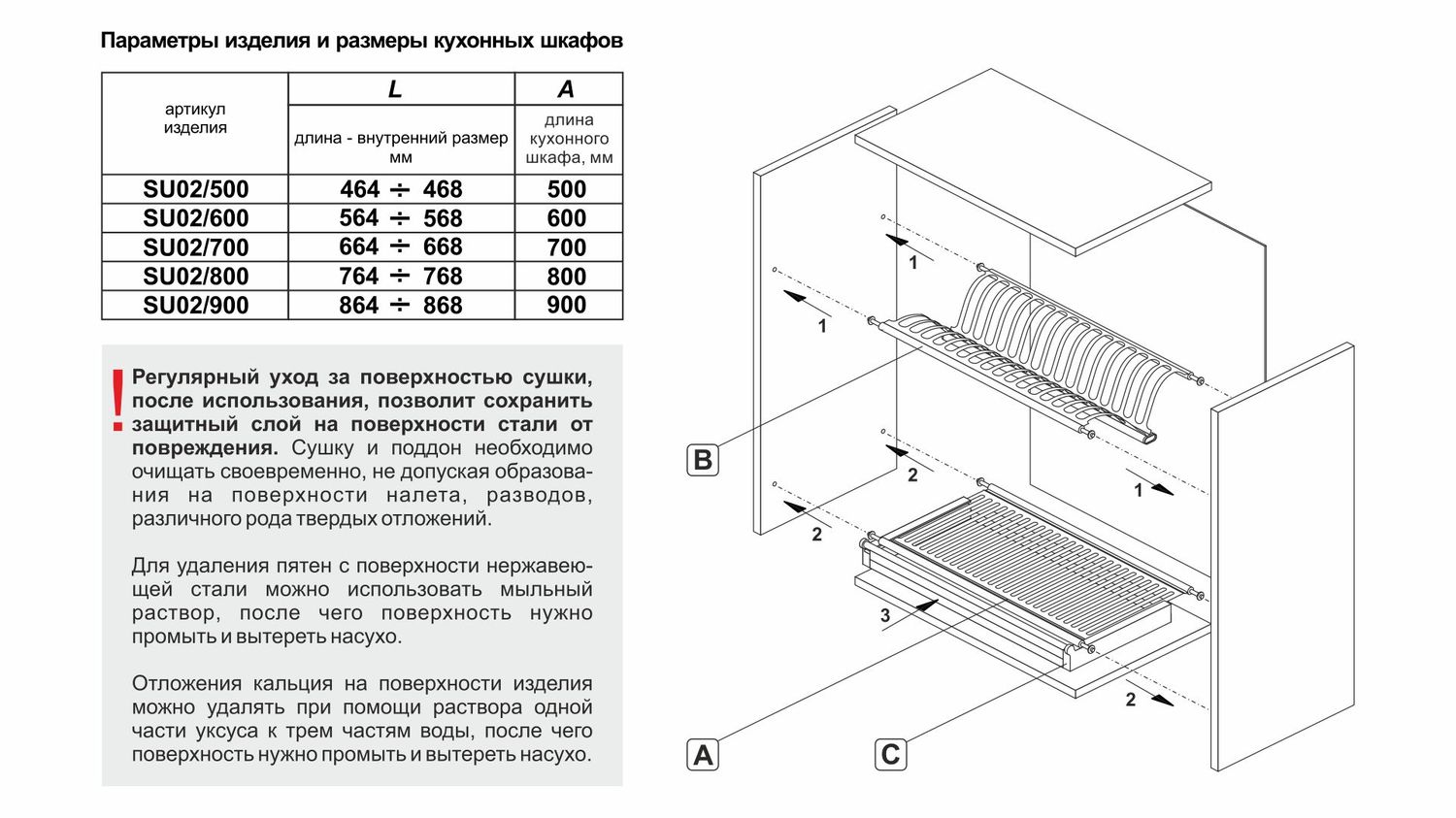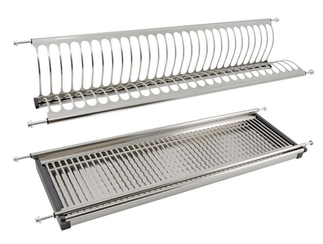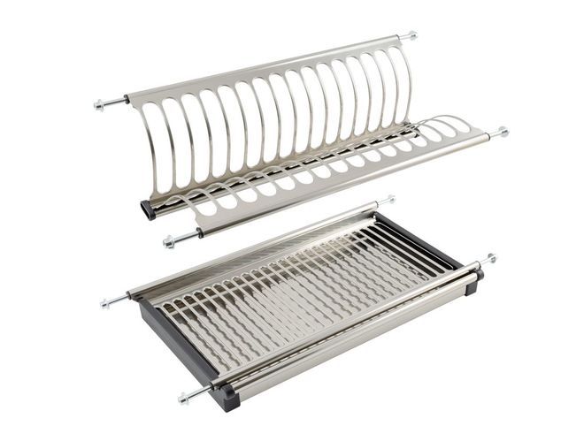 Двухуровневая сушка для посуды быстрого монтажа для современных кухонных гарнитуров позволяет размещать значительное количество вымытой посуды. Модель оснащена стальным поддоном для сбора стекающих с посуды капель воды. Одно из достоинств сушки – быстрый монтаж