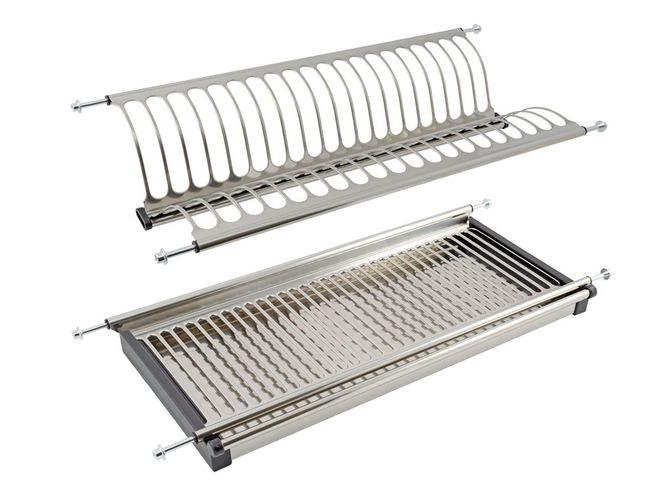 Двухуровневая сушка для посуды быстрого монтажа для современных кухонных гарнитуров позволяет размещать значительное количество вымытой посуды. Модель оснащена стальным поддоном для сбора стекающих с посуды капель воды. Одно из достоинств сушки – быстрый монтаж