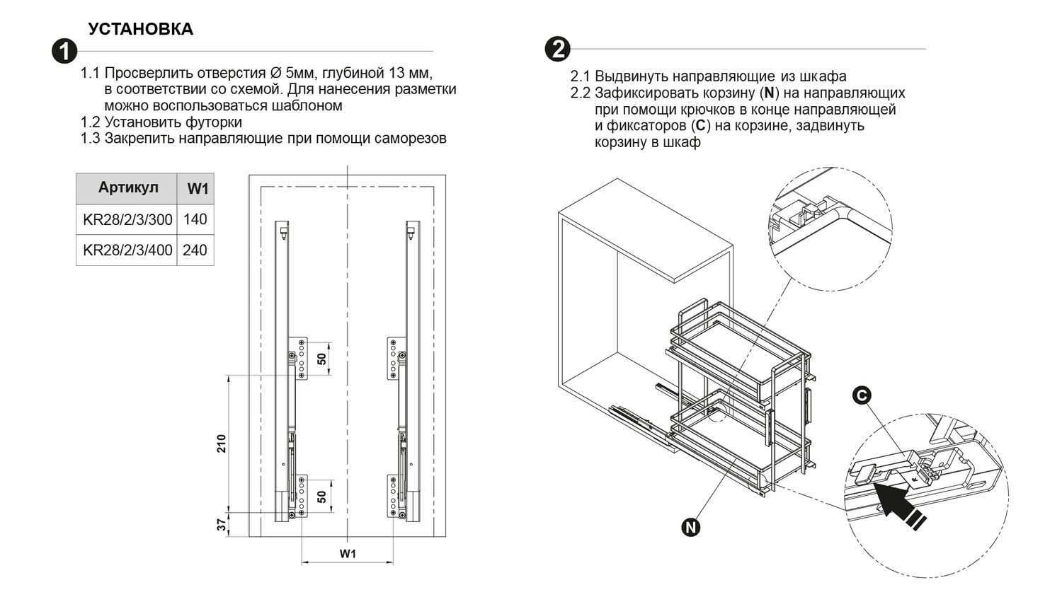 Система выдерживает высокую нагрузку – 30 кг на оба яруса и рассчитана на надёжную работу на протяжении 50 000 циклов открывания/закрывания. Модель устанавливается на дно модуля с помощью направляющих нового поколения с синхронизацией и доведением длиной 450 мм. В комплекте с корзиной идёт шаблон присадочных отверстий, который поможет легко и быстро нанести разметку для установки корзины в базу кухонного гарнитура.