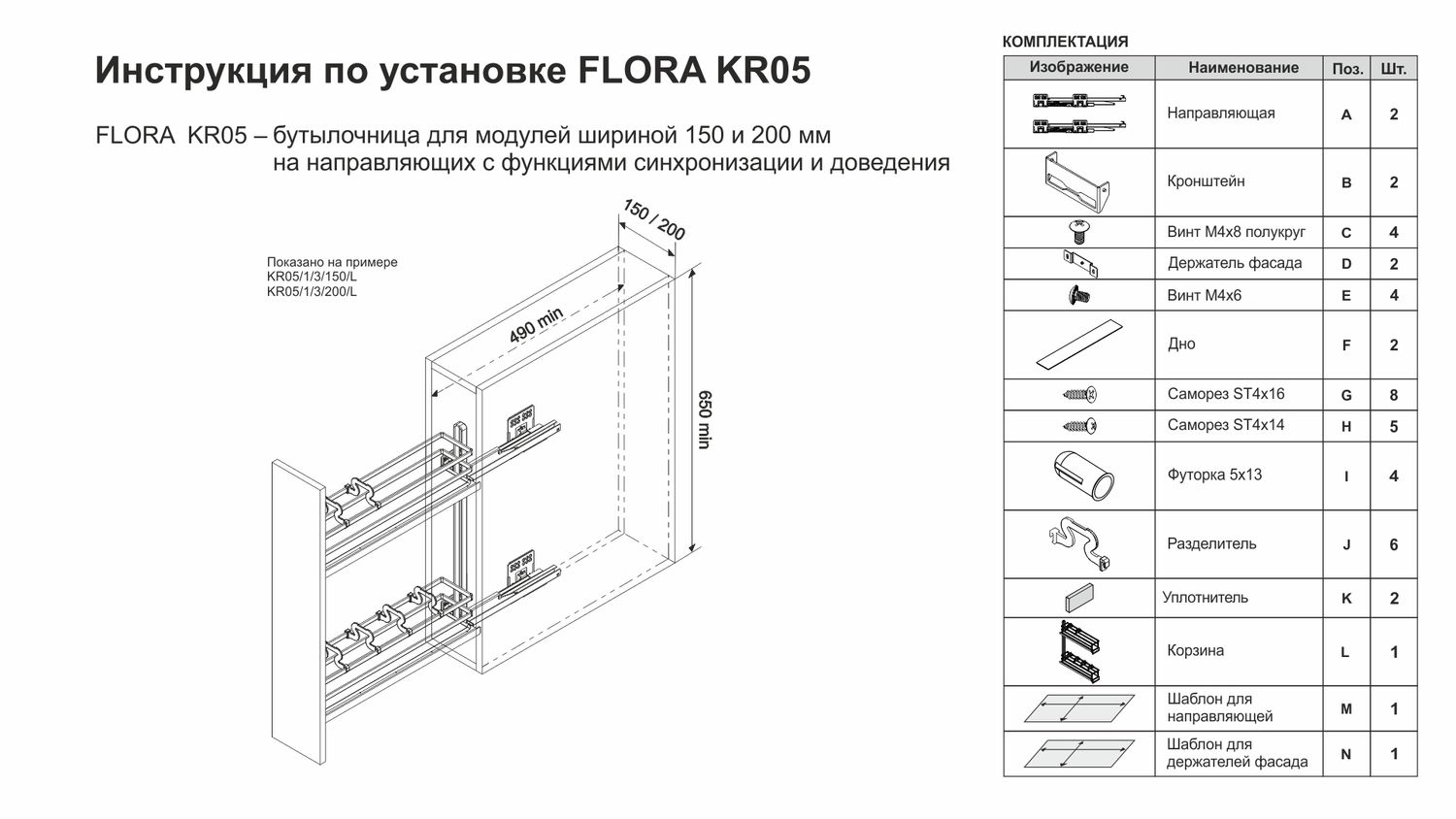 FLORA может быть установлена на левую или правую боковину модуля с помощью направляющих нового поколения с синхронизацией и доводчиком длиной 450 мм, которые обеспечивают легкое, равномерное и бесшумное движение бутылочницы. Система обеспечивают удобную трехмерную регулировку положения фасада.