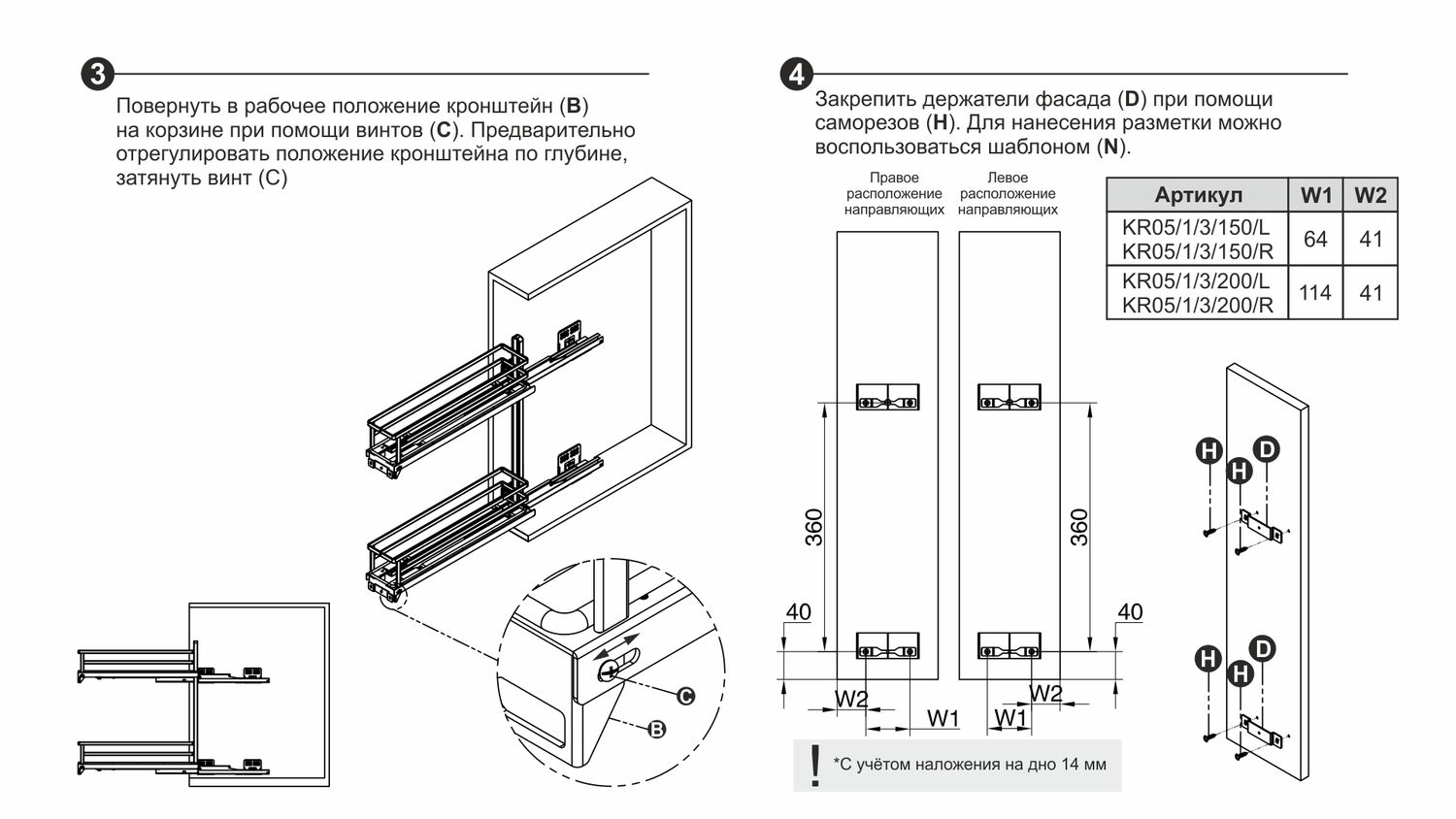 В комплекте с изделием поставляется специальный шаблон присадочных отверстий, который поможет точно определить место для крепления корзины. Шаблон является дополнением к основной инструкции и позволяет легко и быстро нанести разметку для установки сетчатого наполнения в базу кухонного гарнитура.