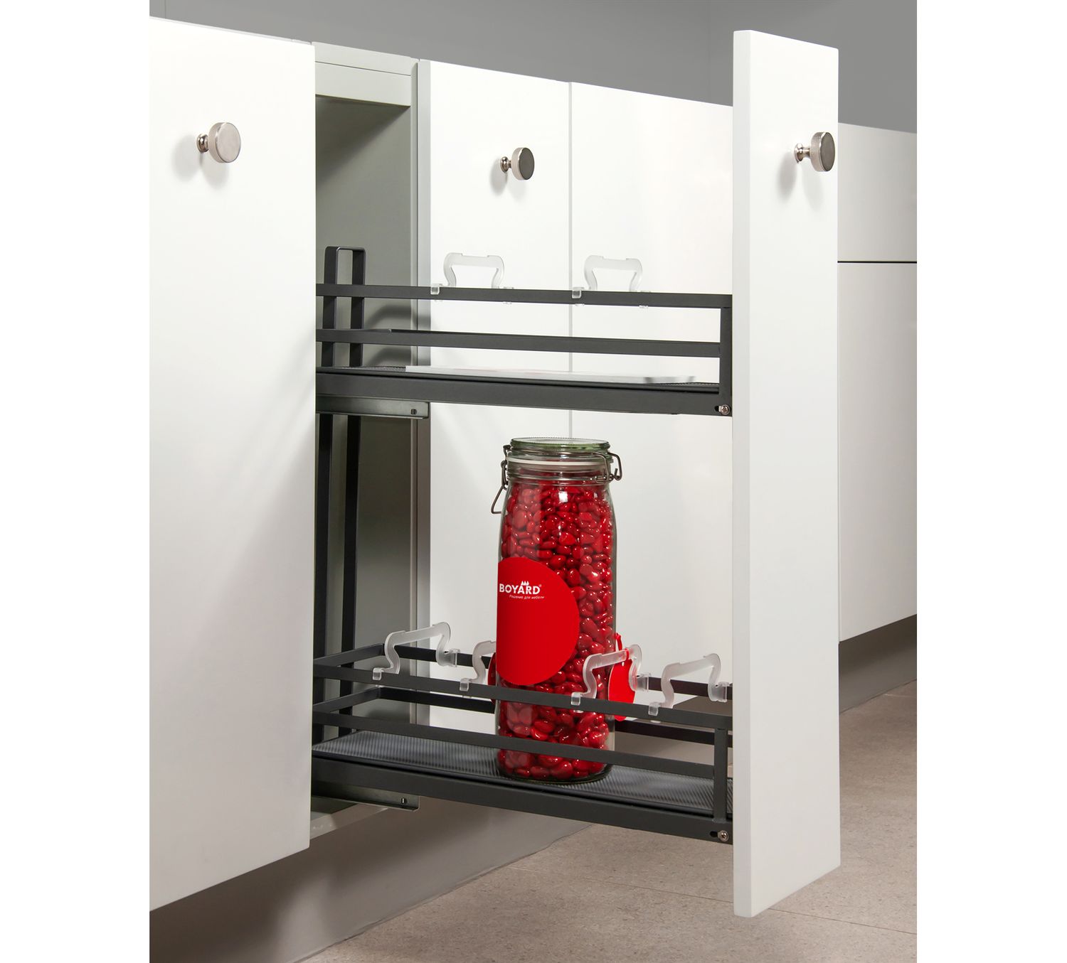 Модель обладает стильным европейским внешним видом, плоской формой боковых прутков корзин. Сплошное дно с антискользящим покрытием и дополнительные съемные делители FLORA гарантируют максимальную устойчивость хранимой утвари на обоих этажах. Кроме того, дно можно легко снять для чистки и мытья.
