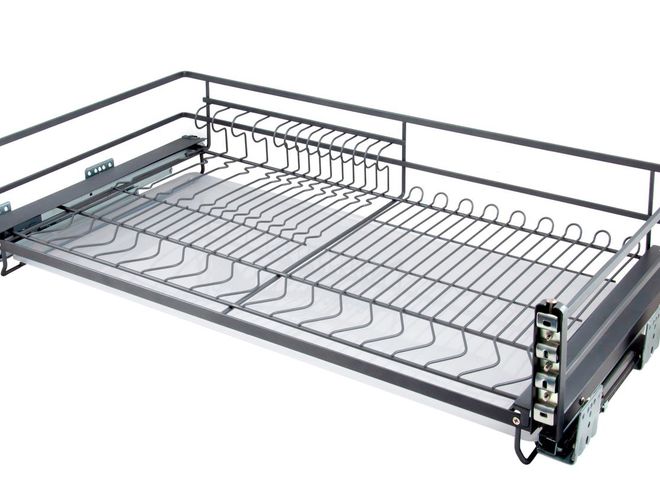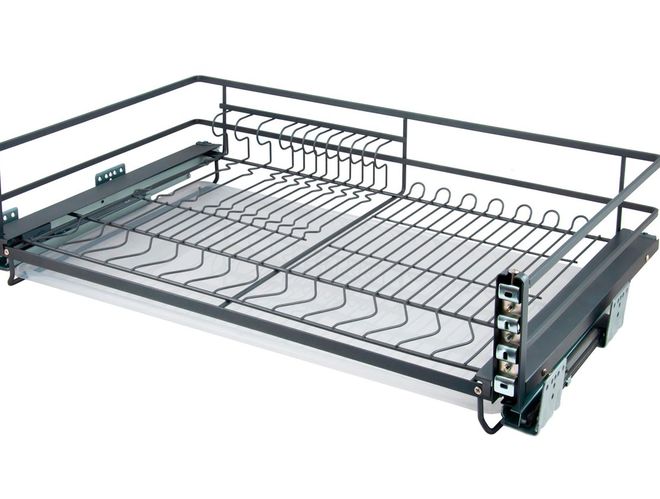 Выдвижная корзина-сушка CARMA KRS05 в порошковом покрытии графитового оттенка с плоским прутком предназначена для хранения разноплановой посуды в нижней базе мебельного гарнитура. Продуманная схема расположения внутренних отсеков корзины позволяет одинаково качественно просушить как крупные и глубокие тарелки, крышки, кастрюли, так и небольшие блюдца и чашки. Модель оснащена удобным поддоном из современного экологичного пластика для сбора стекающих с посуды капель. Поддон легко снимается для чистки и мойки. CARMA устанавливается на направляющие с синхронизацией и доведением длиной 450 мм. Модель предложена в трёх вариантах ширины – 600, 800 и 900 мм. Качественное современное порошковое покрытие обладает повышенными прочностными и антикоррозийными свойствами.